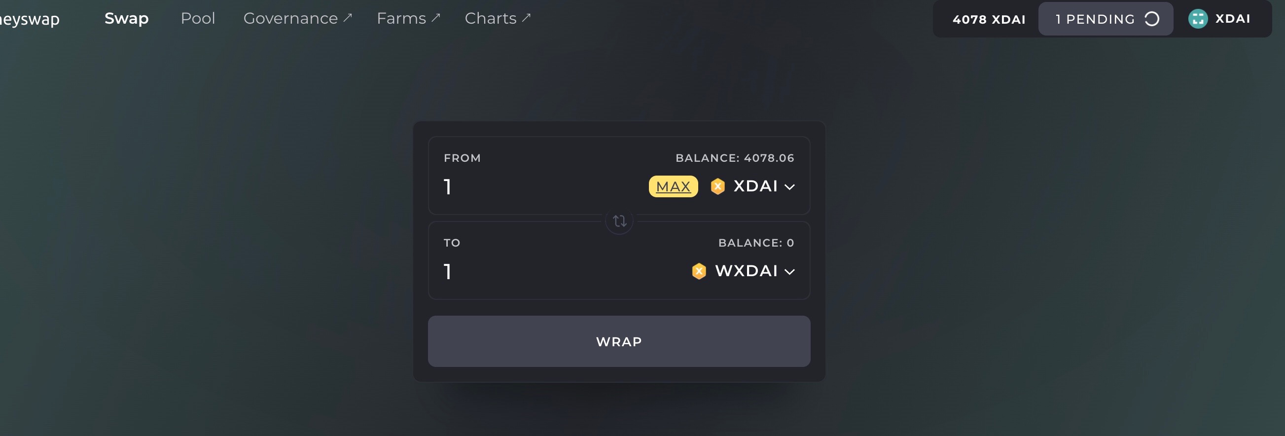 I used Honeyswap (Honeyswap Interface) to wrapped xdai to wxdai (for 1 xdai to start) and I don’t know how (1) (I use frame with a ledger as wallet) but I finally sent 1 ether (!!!) to this address : 0xe91D153E0b41518A2Ce8Dd3D7944Fa863463a97d